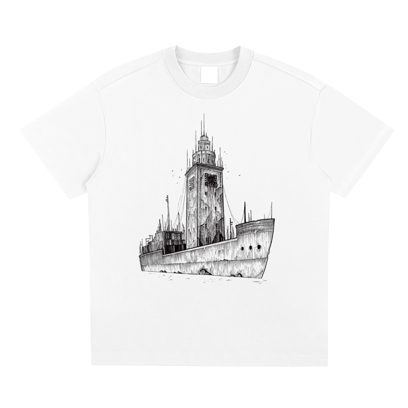 Timur drew the artwork during the early stages of the Covid pandemic. It's an abandoned structure drifting on a massive barge in the ocean, in a world where no one is left. To add to the mystery of the drawing, there's a QR code on the tower.